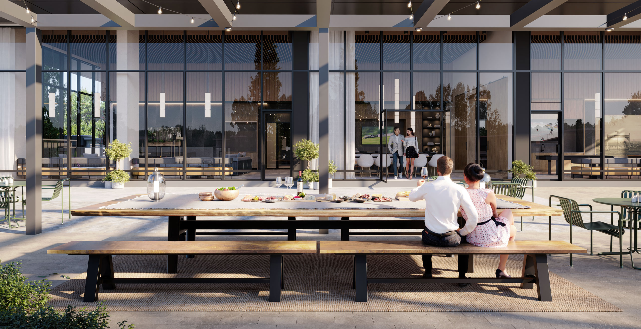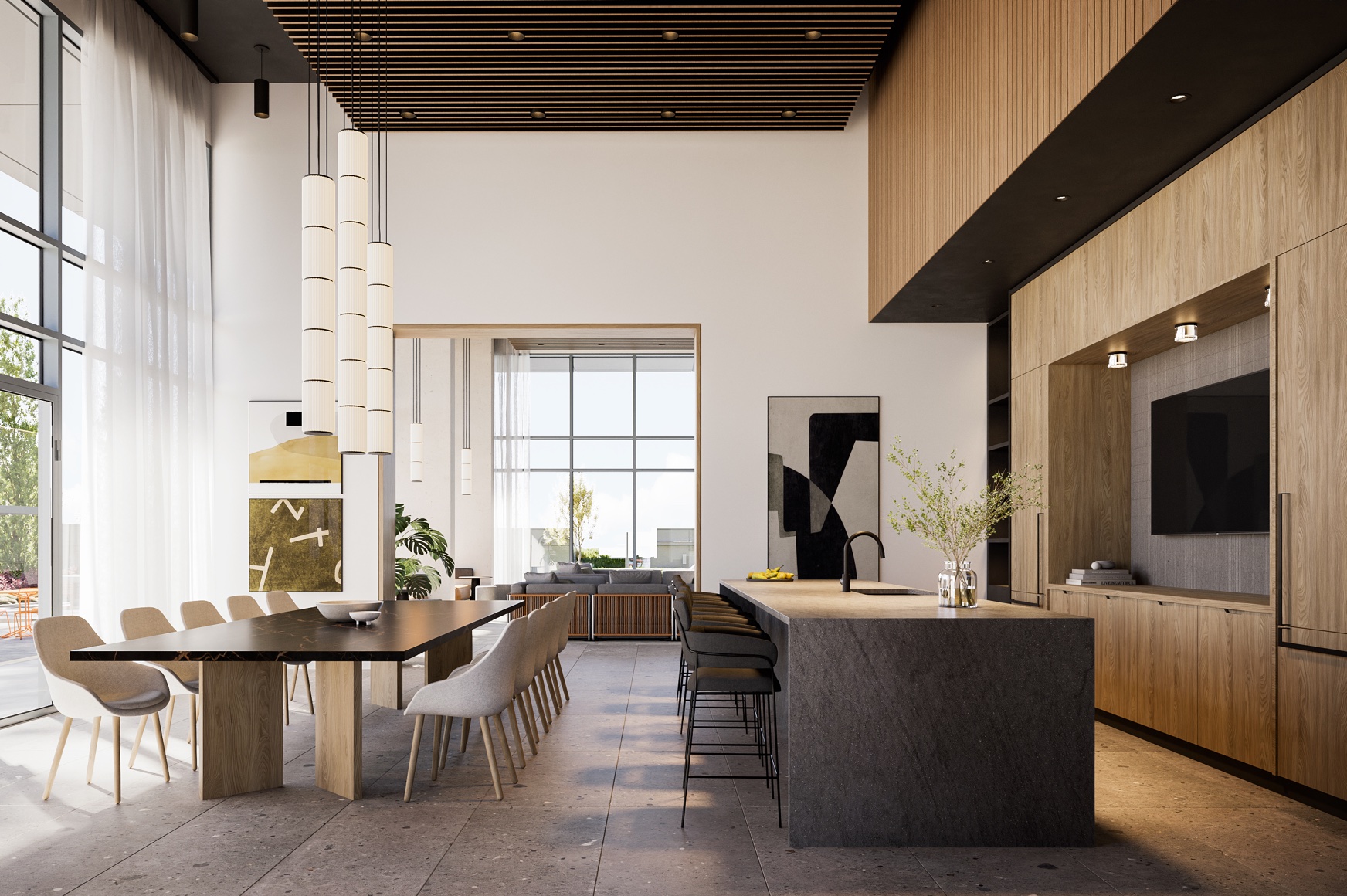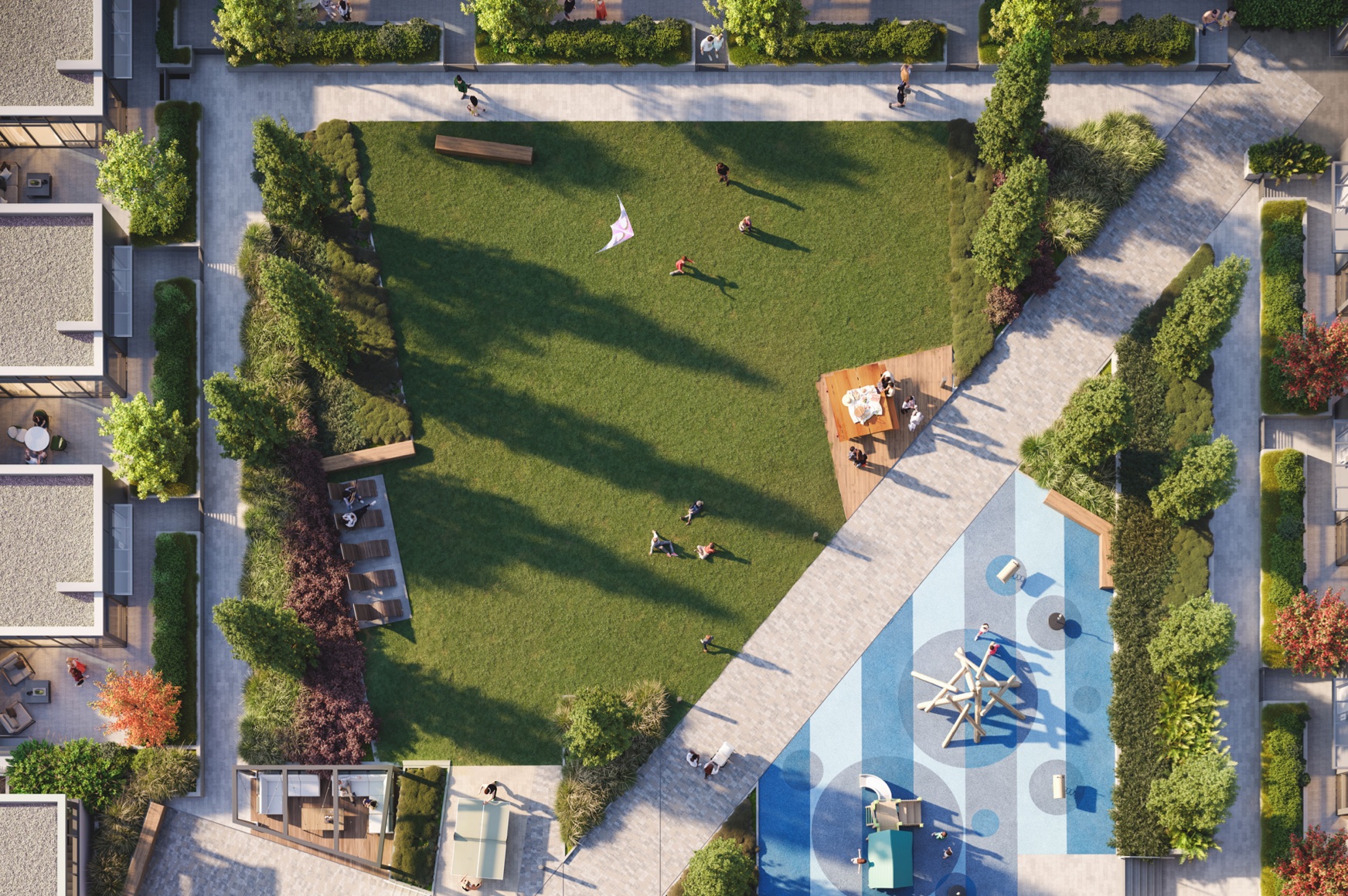 Outdoors, the podium greenspace offers a relaxing retreat with an outdoor kitchen and BBQ, a children’s play area, a fireside lounge, ping pong tables, a walking loop, and various seating areas for socializing or enjoying quiet moments.