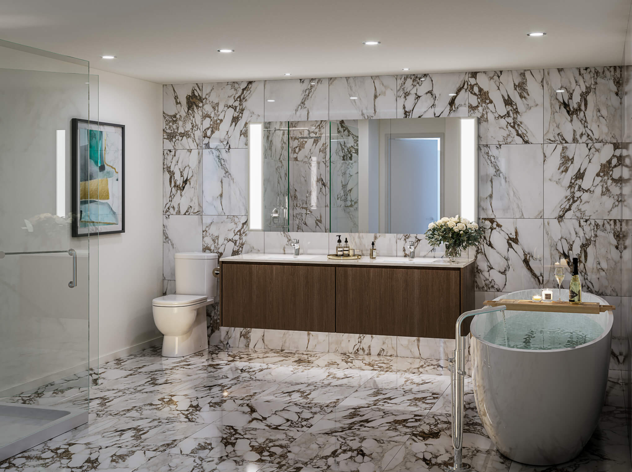 Designed with a spa-like ambiance, the bathrooms offer floating vanities with premium polished quartz countertops and undermount sinks with modern chrome faucets. Select homes feature floating mirrored backlit medicine cabinets in the master ensuite, dual-flush toilets, large format marble-inspired porcelain floor tiles, and tub/shower surrounds. Additional luxurious touches include a rain shower head and wand combo, free-standing deep soaker tubs, and smart toilets in select homes.