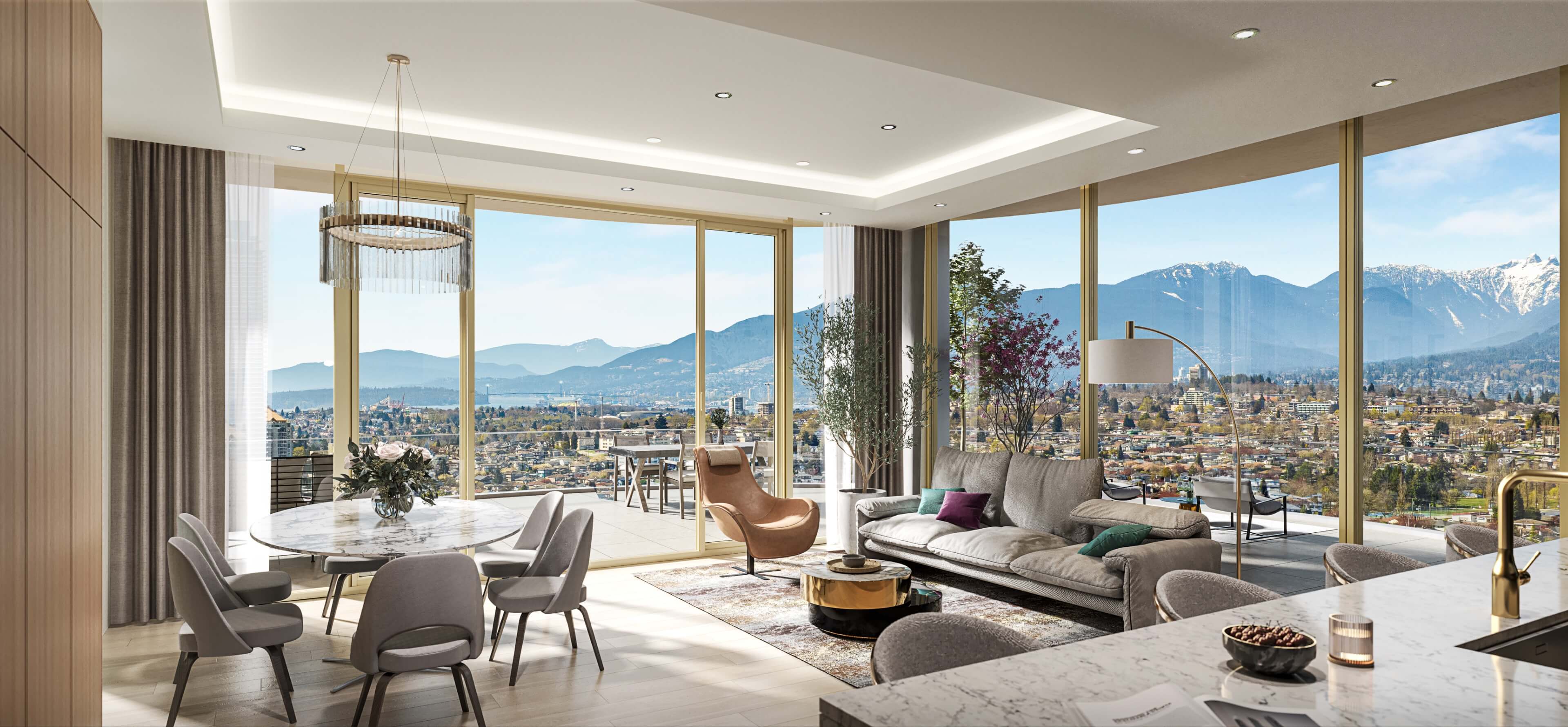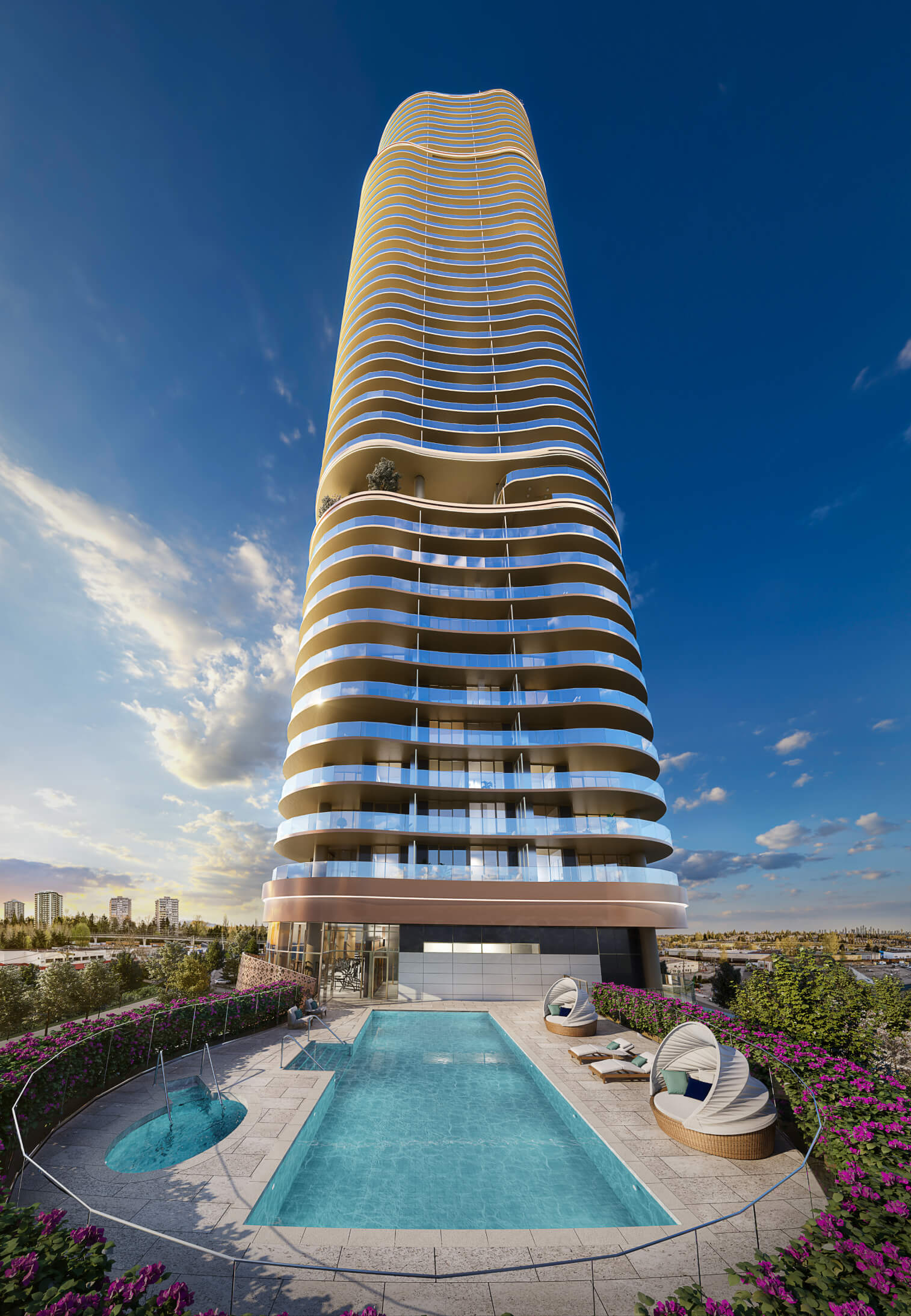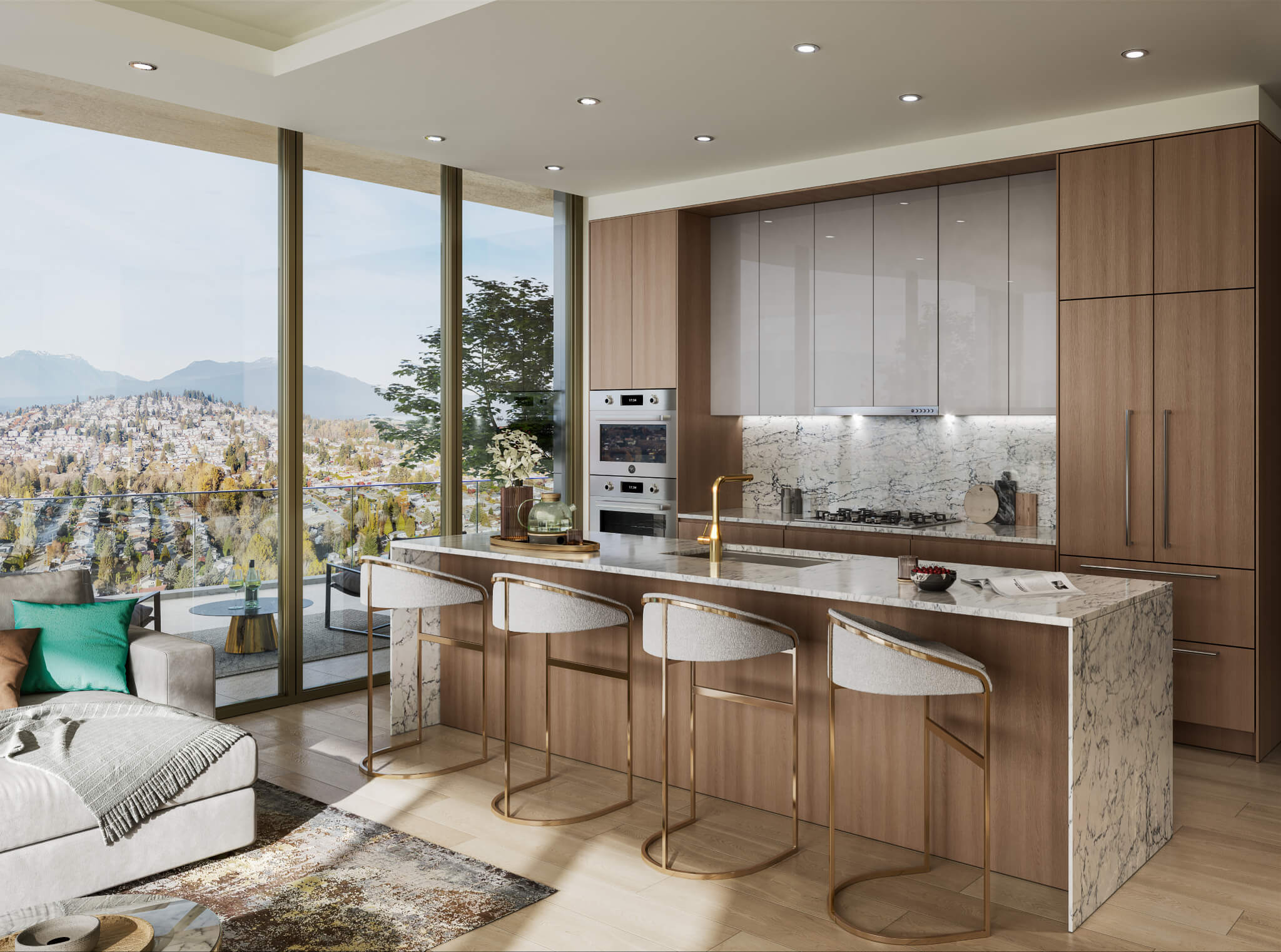 This remarkable 47-storey tower in Brentwood, Burnaby stands as the tallest structure within the community, offering a total of 277 meticulously crafted units. These homes, starting from the 16th floor, include a range of 1, 2, and 3-bedroom suites spanning from 422 to 1,318 sq ft, along with exclusive three-level townhome residences. Upon entering, residents and guests are greeted by a grand hotel-style lobby featuring a soaring double-height ceiling and an elegant lounge, setting the tone for modern sophistication. The building also boasts a high-performance thermal envelope, ensuring optimal energy efficiency.
